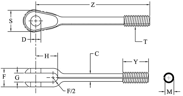 Dash No. RH | Dash No. LH | J Wire Rope Dia. Ref. | Min. Breaking Strength. | Thread T UNF-3A | C +.006 -.000 | D +.002 -.000 | F +.010 -.005 | G +.010 -.000 | H | M Max. | M Min. | S Spher Dia | Y ?.047 | Z ?.047 |